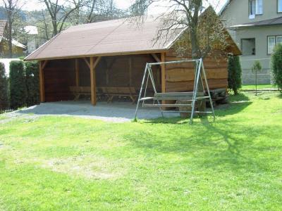Před vchodem do hlavní chalupy je posezení se zahradním pavilónem. Okolo chaty je velká částečně oplocená zahrada se zastřešeným bazénem, který je solárně vyhříván. Je zde taky velká trampolína, které si užijí i dospělí. Pro děti máme houpačky, pískoviště, stůl na stolní tenis a basketbalový koš.