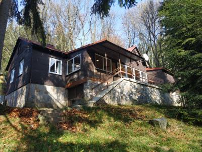 Chata má rozlehlý pozemek, který je lemován lesem a říčkou.